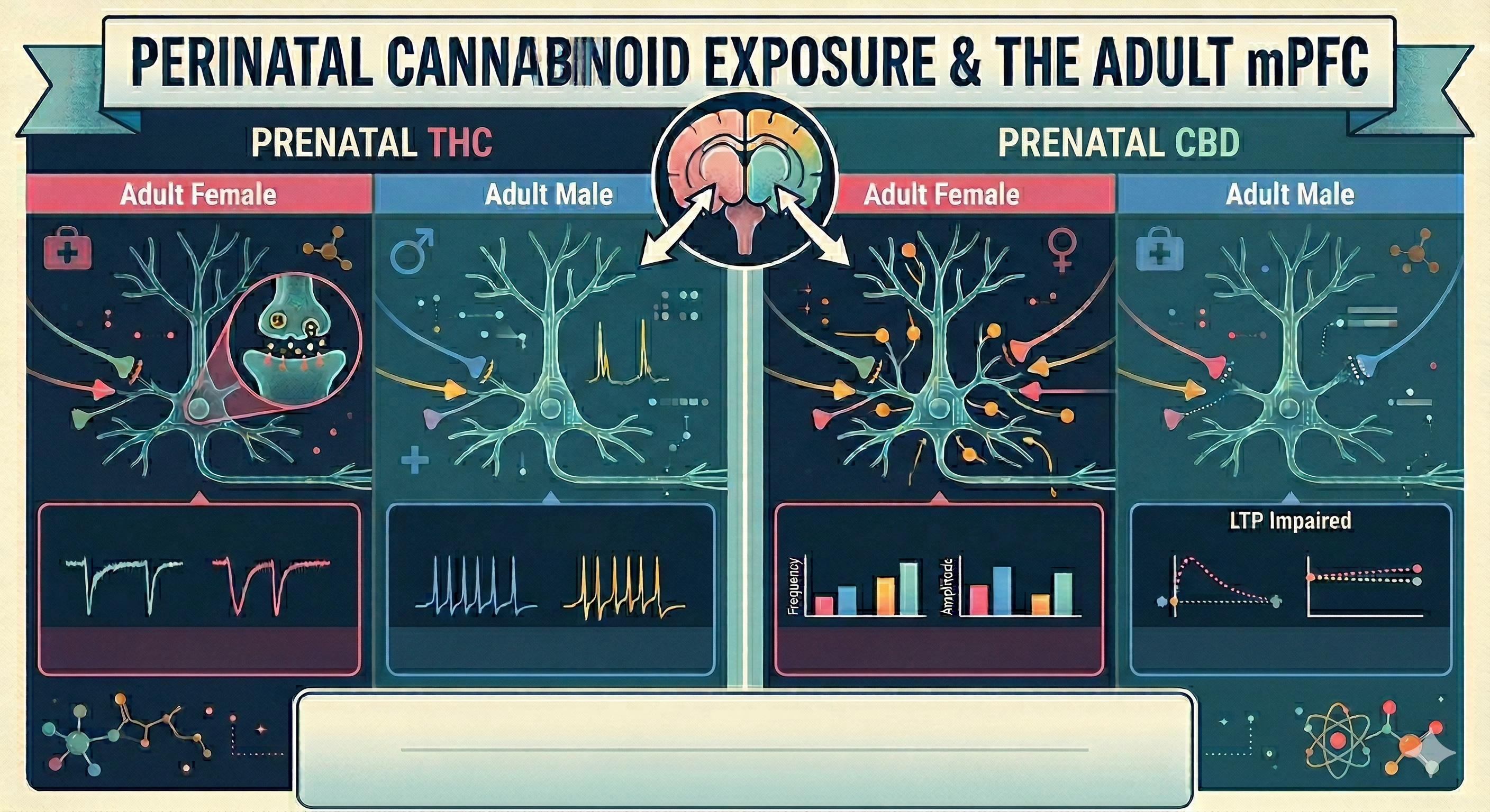 Alors que la perception des cannabinoïdes évolue vers une banalisation croissante, une question cruciale demeure : quel est l’impact réel d’une exposition in utero sur le cerveau en devenir ? Dans cette étude, nous avons exploré les conséquences à long terme du THC et du CBD sur le centre de commande de la cognition : le cortex préfrontal médial (mPFC).